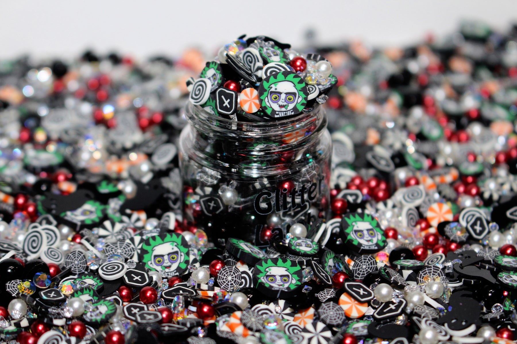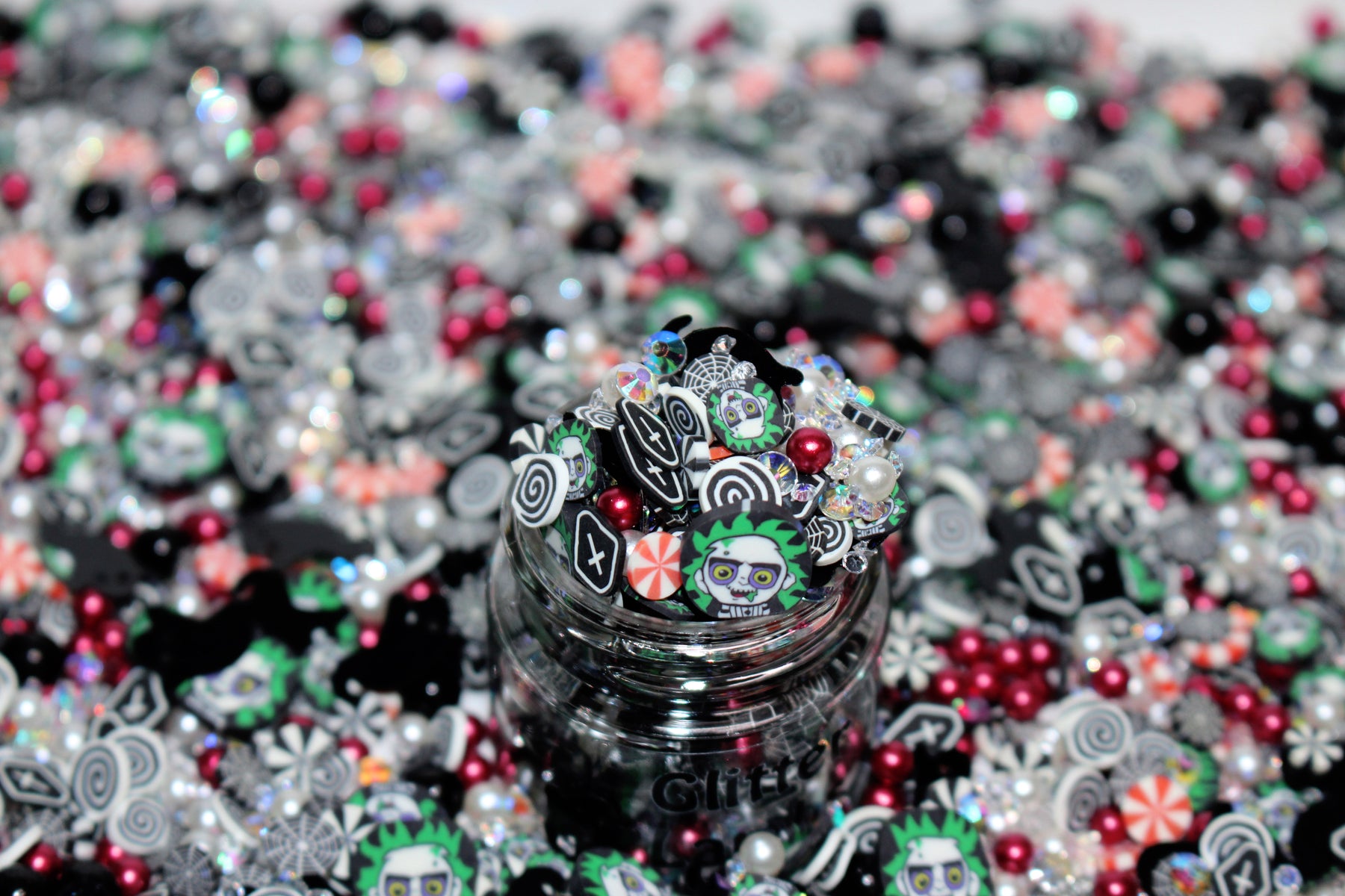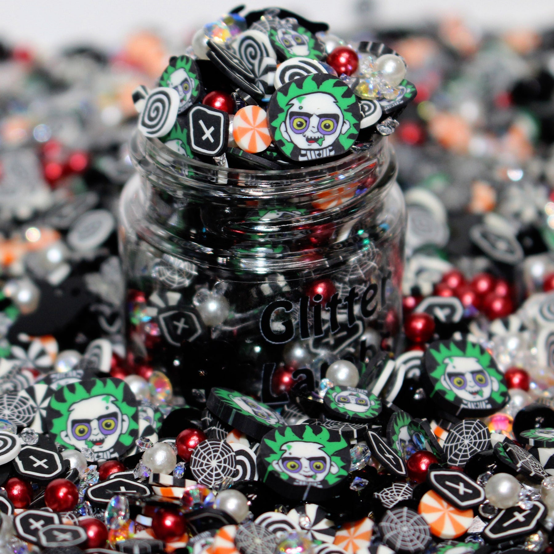 Take a number and have a seat… this glitter mix is straight out of the Beetlejuice afterlife! Inspired by the unforgettable waiting room scene, this blend is packed with kooky Beetlejuice character clay slices, swirly black-and-white spirals, candy pops of orange, eerie pearls, and deep pops of red.