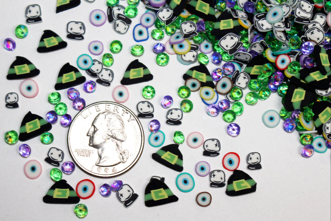 Straight out of a kooky cartoon cauldron, this mix bubbles with mischief and sparkle! Inspired by those old-school Looney Tunes witchy antics (and maybe a dash of Hansel & Gretel trouble), Cauldron Crackle Mix is packed with green witch hats, spooky eyeballs crystal balls and of course sprinkled with shimmering sparkly green and purple rhinestones.Β Β