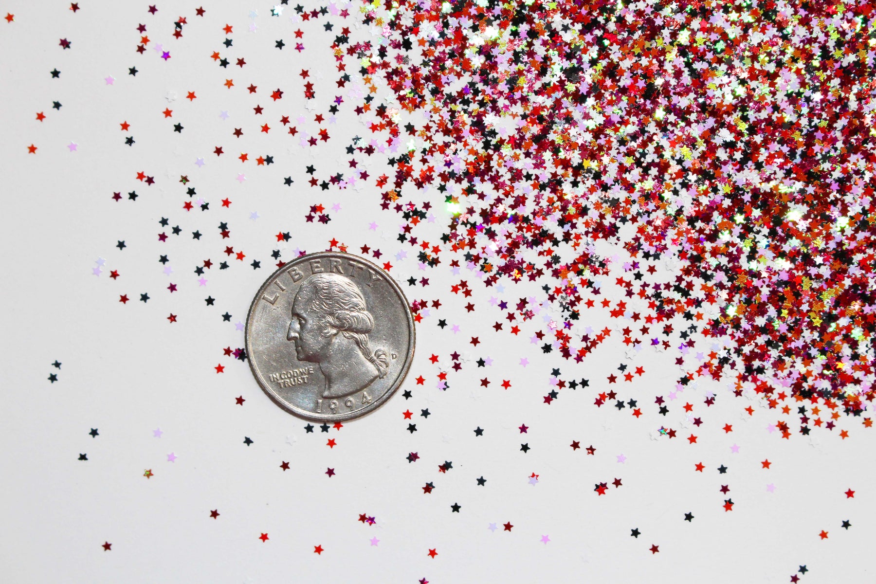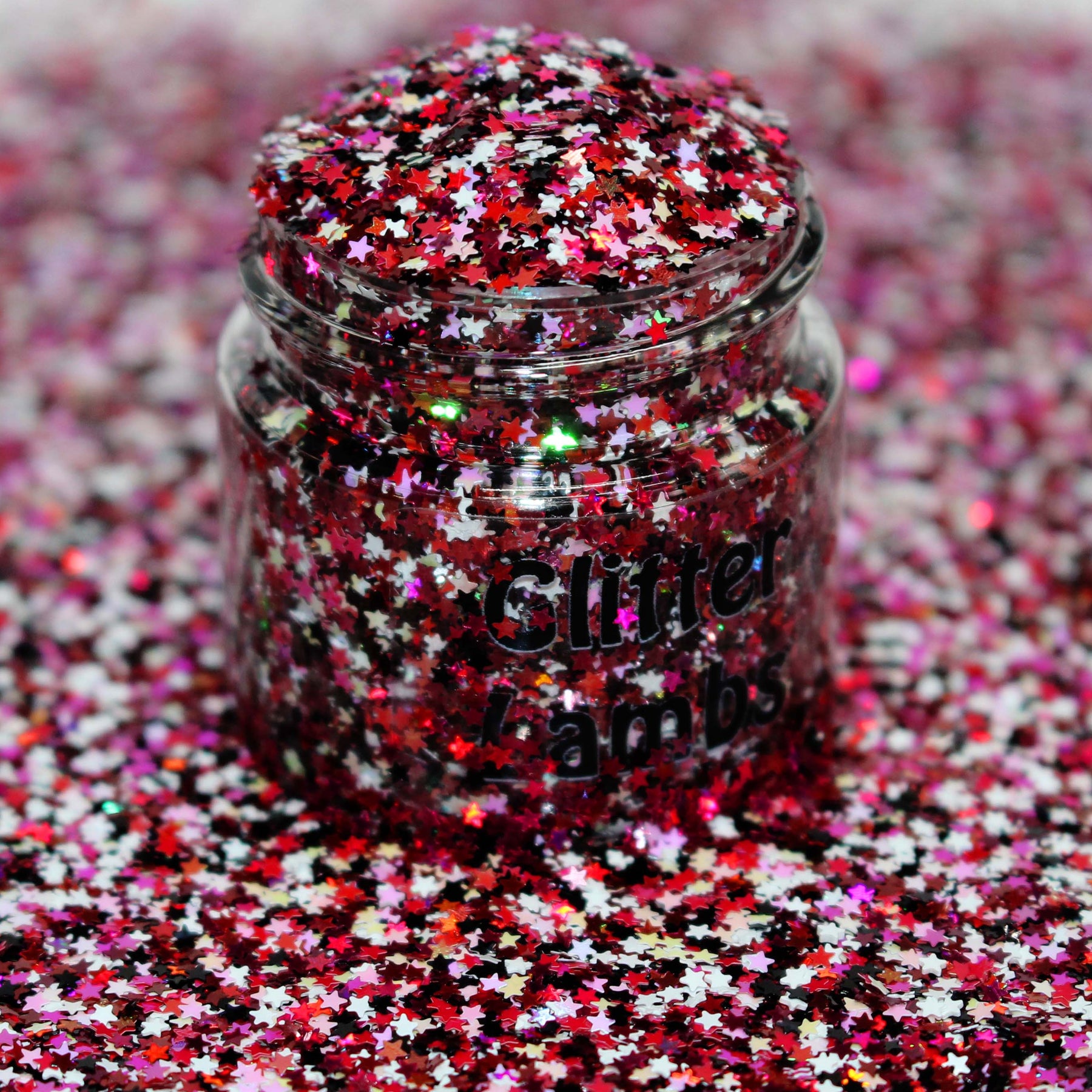 Twilight Twinkle glitter is a bold 1mm (.040) metallic star glitter mix featuring striking red, black, pearlascent pink, white with reflective tones that create intense sparkle under any light. This dramatic star blend is perfect for statement nail art, acrylic nails, gel designs, epoxy resin pours, shaker cards, slime mixes, snow globe tumblers, and DIY craft embellishments.