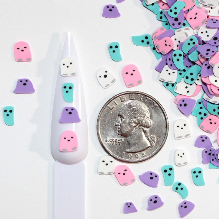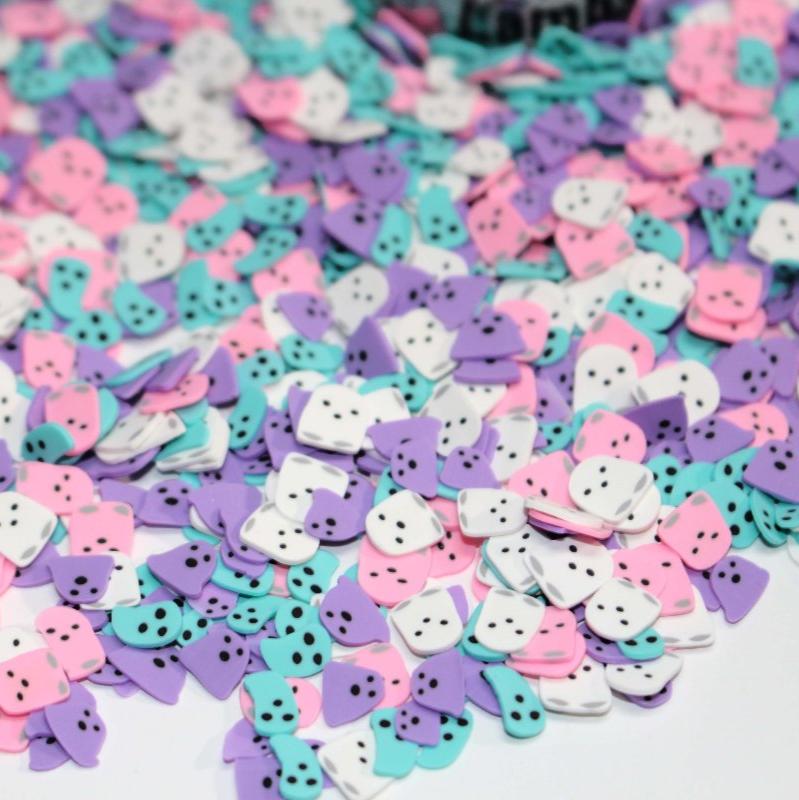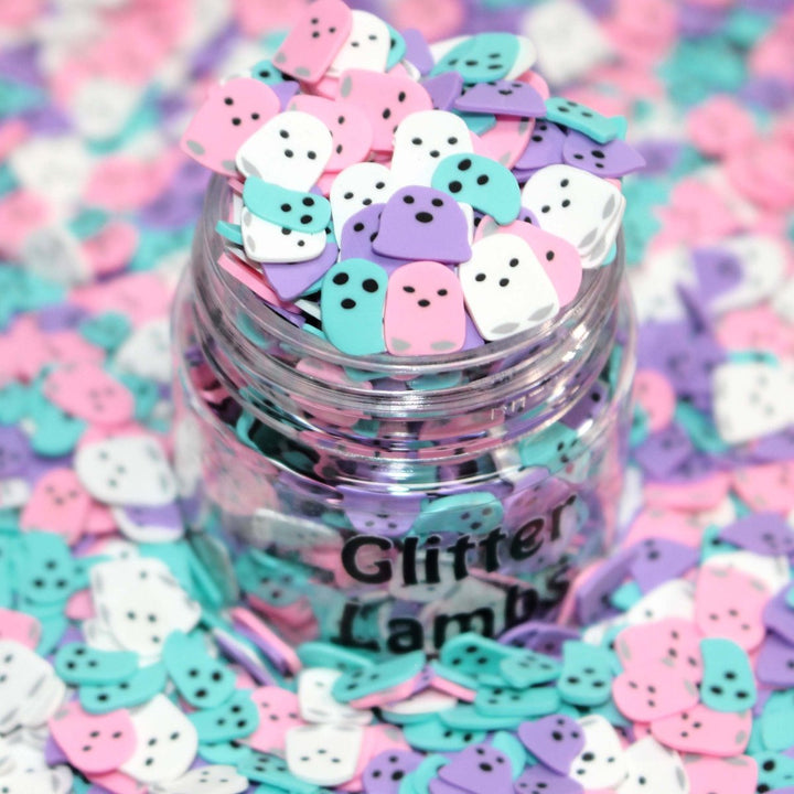 Four Little Ghosts Jumping On The Bed. This mix has 5mm clay ghosts in pink, blue/aqua, purple and white. Great for arts & crafts, shaker cards, adding to picture frames as embellishments, shaker hairbows, shaker keychains, etc. Please conduct your own testing before using in final project. Not Edible. See how big a 15mL jar is at this link: CLICK HERE